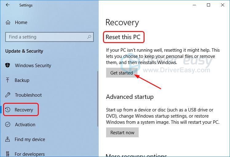 - Перейти к восстановление раздел, затем нажмите Начать под Сбросить этот ПК вариант.