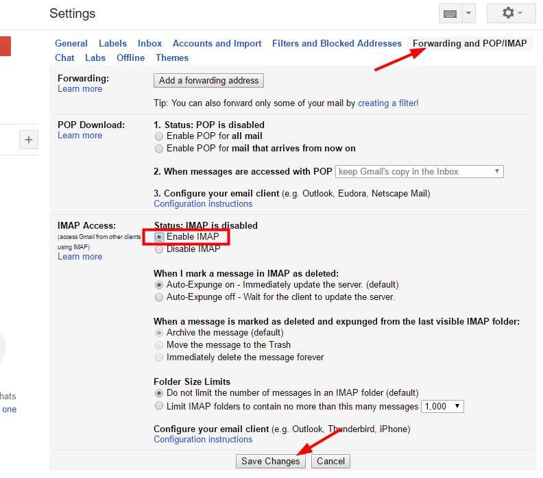 3) В настройках нажмите Переадресация и POP / IMAP вкладка и выберите Включить IMAP (который находится в статусе IMAP в разделе доступа IMAP). После этого нажмите Сохранить изменения.