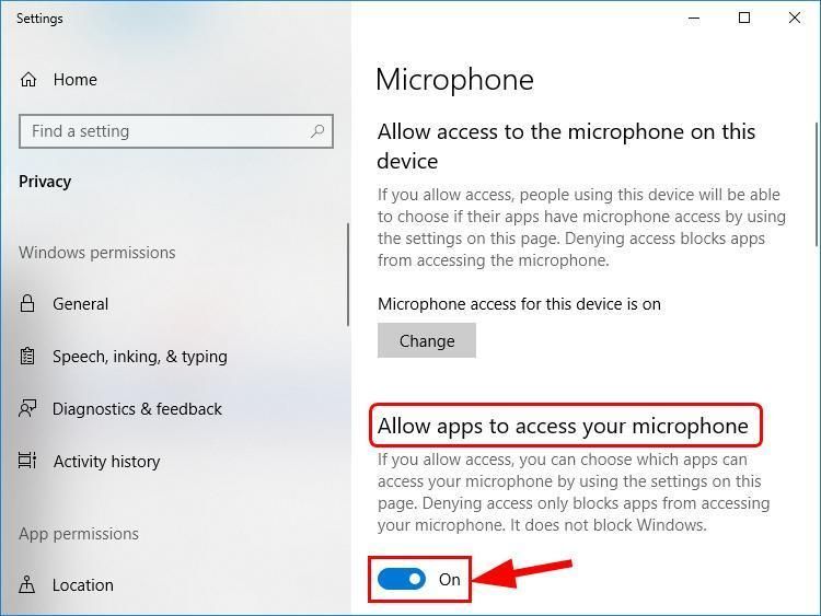 2) Под Разрешить приложениям доступ к вашему микрофону раздел, убедитесь, что переключатель На так что вы можете разрешить приложениям доступ к вашему микрофону.