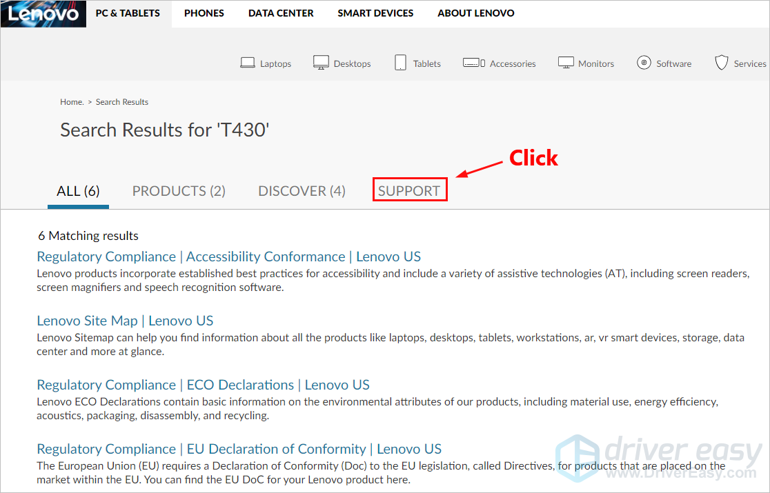 - под Результаты поиска для ‘T430’, нажмите на СЛУЖБА ПОДДЕРЖКИ Вкладка. Затем вы будете перенаправлены на страницу поддержки T430.