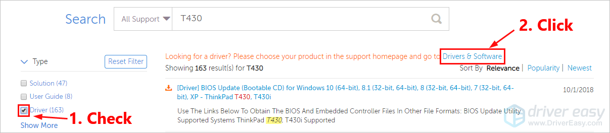 - Налево, установите флажок рядом с Водитель, затем нажмите Драйверы Программного обеспечения. Вы будете перенаправлены на страницу загрузки драйверов для T430.