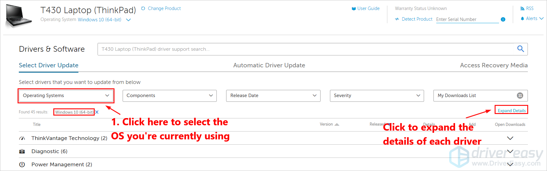 Если у вас нет времени, терпения или навыков работы с компьютером для загрузки и обновления драйверов для Lenovo T430 вручную, вместо этого вы можете сделать это автоматически с Водитель Легко. Вам не нужно точно знать, на какой системе работает ваш ноутбук, вам не нужно рисковать загрузкой и установкой неправильного драйвера, и вам не нужно беспокоиться об ошибках при установке. Driver Easy справляется со всем этим.