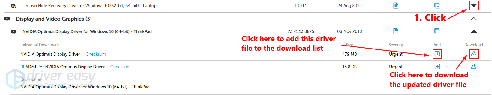 - Нажмите нисходящий треугольник чтобы просмотреть детали этого водителя. Тогда вы можете нажать кнопка загрузки скачать этот драйвер. Если вы хотите загрузить несколько драйверов, вы также можете нажать кнопка плюс чтобы добавить его в свой список загрузок в первую очередь.