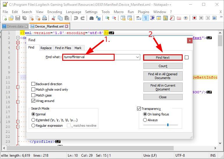 - На клавиатуре нажмите Ctrl а также F в то же время, затем введите turnoffinterval и нажмите Найти следующий.