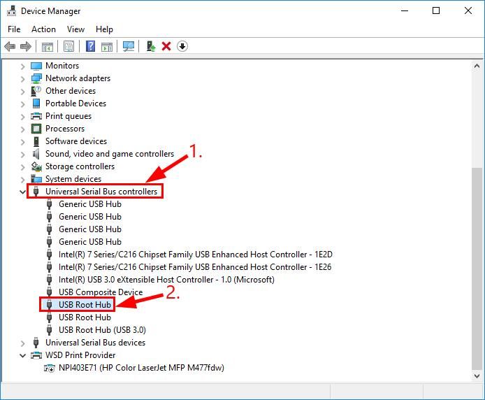 - Дважды щелкните на Контроллеры универсальной последовательной шины > USB Root Hub.