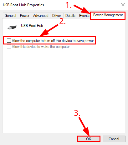 Исправление 4: Отключите управление питанием корневого концентратора USB
