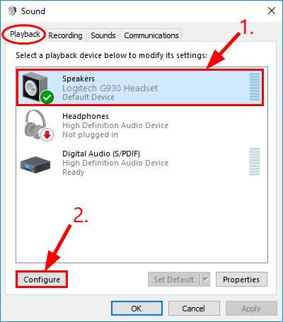 - в воспроизведение вкладка, нажмите на Компьютерные колонки (Гарнитура Logitech G930) и нажмите конфигурировать.