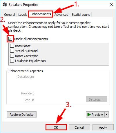 - Нажмите на Улучшения вкладка, то Поставьте галочку до Отключить все улучшения и нажмите Хорошо.