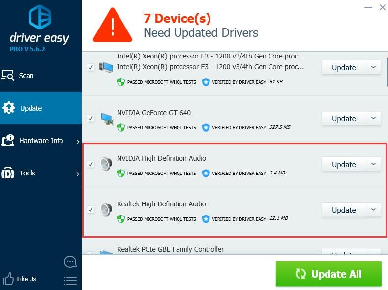 3) Нажмите Обновить кнопка рядом с помеченным звуковым драйвером и / или драйвером USB для автоматической загрузки и установки правильной версии этого драйвера (вы можете сделать это с помощью СВОБОДНО версия).