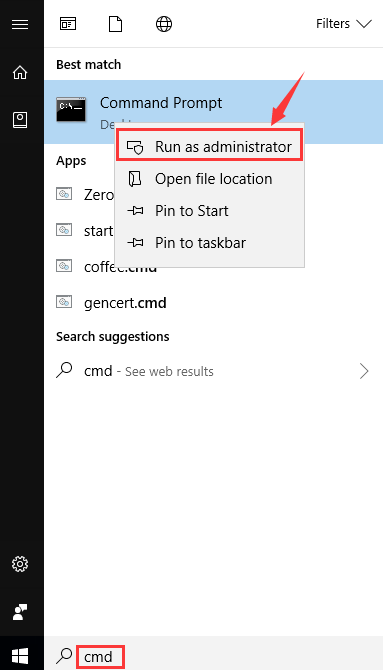 1) На клавиатуре нажмите Ключ Windows и S в то же время, введите CMD. Щелкните правой кнопкой мыши Командная строка и нажмите Запустить от имени администратора.
