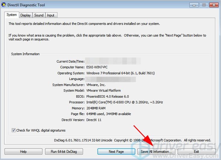 - DirectX Диагностический инструмент всплывает. Нажмите Сохранить всю информацию.