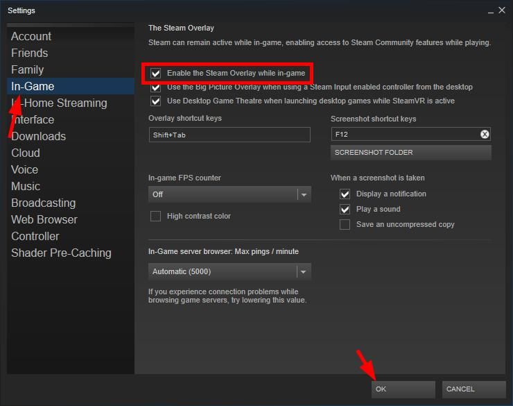 Чтобы получить доступ к оверлею Steam, убедитесь, что вы включили его в настройках Steam. Чтобы проверить настройки наложения Steam: