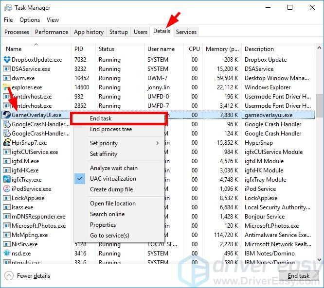 3) Нажмите на подробности вкладка (или Процессы Если вы находитесь на Windows 7), щелкните правой кнопкой мыши GameOverlayUI.exe и нажмите Конечная задача. (Это закроет процесс наложения Steam и сразу же перезапустится.)