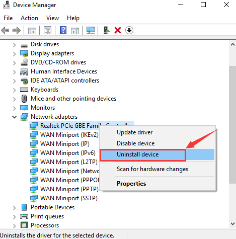 3) Щелкните правой кнопкой мыши драйвер вашей сетевой карты и выберите Удалить устройство.