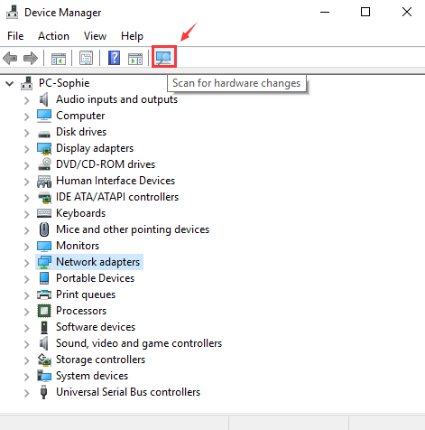 4) После завершения удаления нажмите Сканирование на предмет изменений оборудования Кнопка сверху. Ваша система автоматически просканирует и установит драйвер сетевого адаптера для вашего ПК.