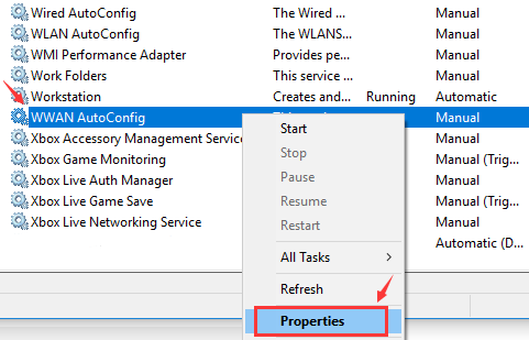 2) На клавиатуре нажмите W ключ для быстрого поиска WWAN AutoConfig категорию, затем щелкните правой кнопкой мыши и выберите свойства.