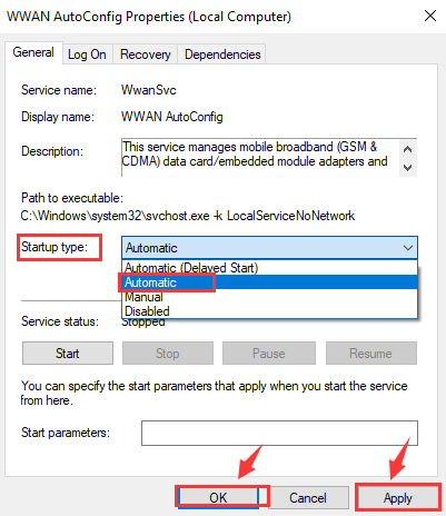 3) Изменить Тип запуска из выпадающих опций автоматическая. Затем нажмите Применять а также Хорошо сохранить изменения.