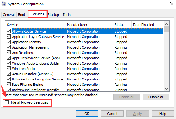 2) Перейдите к Сервисы вкладка, то снимите галочку коробка для Скрыть все службы Microsoft если это отмечено.