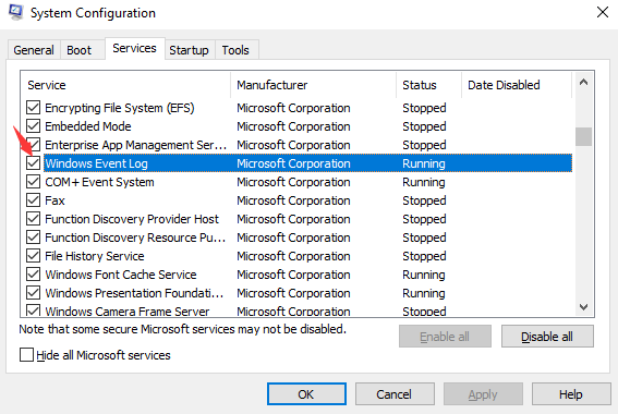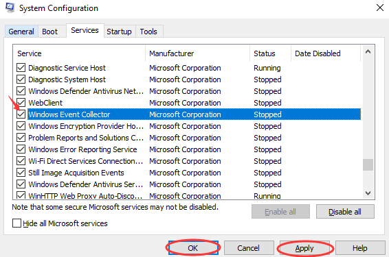 3) Найдите Журнал событий Windows а также Windows Event Collector соответственно. Убедитесь, что коробки для них тикали. Затем нажмите Применять а также Хорошо сохранить изменения.