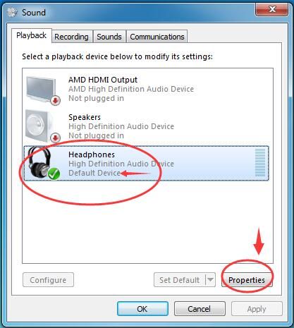 2) Выберите аудиоустройство по умолчанию и нажмите свойства.