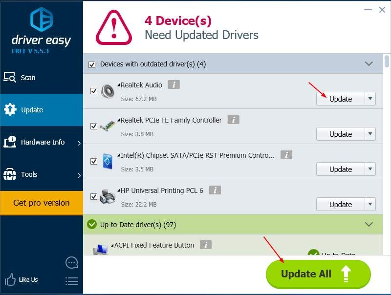 Или нажмите Обновить все для автоматической загрузки и установки правильной версии всех драйверов, которые отсутствуют или устарели в вашей системе (для этого требуется версия Pro — вам будет предложено выполнить обновление при нажатии кнопки «Обновить все»).