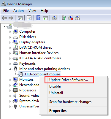 3. Разверните категорию «Мыши и другие указательные устройства«. В этой категории щелкните правой кнопкой мыши на устройстве мыши и выберите Обновление программного обеспечения драйвера … В этом случае мышь Logitech отображается как HID-совместимая мышь.