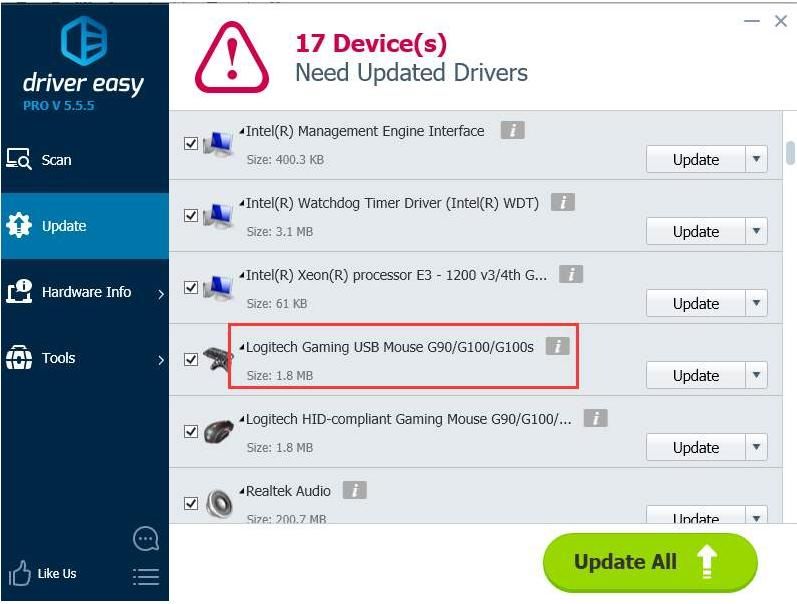 3) Нажмите Обновить Кнопка рядом с помеченным драйвером мыши Logitech для автоматической загрузки и установки правильной версии этого драйвера (вы можете сделать это с БЕСПЛАТНОЙ версией). Или нажмите Обновить все для автоматической загрузки и установки правильной версии всех драйверов, которые отсутствуют или устарели в вашей системе (для этого требуется версия Pro — вам будет предложено выполнить обновление при нажатии кнопки «Обновить все»).