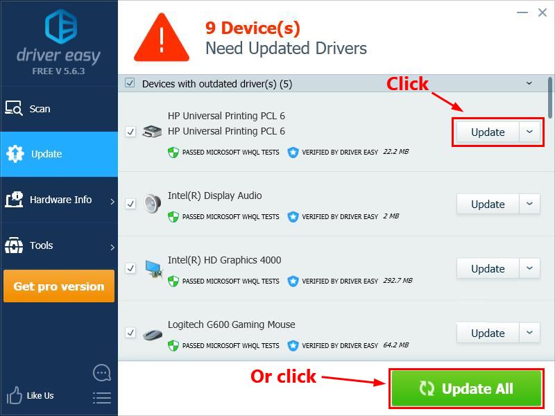 - Нажмите Обновить Рядом с вашим устройством автоматически загружается правильная версия его драйвера, затем вы можете установить его вручную. Или нажмите Обновить все для автоматической загрузки и установки правильной версии всех драйверов, которые отсутствуют или устарели в вашей системе (это требует Pro версия — вам будет предложено обновить, когда вы нажмете Обновить все. Ты получаешь полная поддержка и 30-дневный возврат денег гарантия).