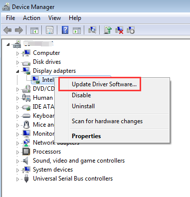 3. Разверните категорию Видеоадаптеры. Щелкните правой кнопкой мыши на видеокарте (используемой карте) и выберите Обновление программного обеспечения драйвера …