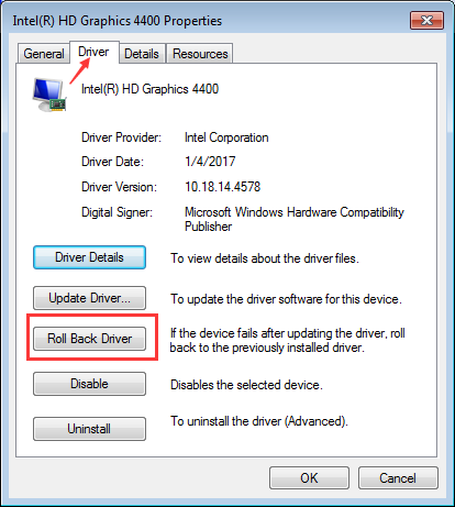 2. Перейти к Водитель вкладка и нажмите Откат драйвера. (Обратите внимание, что если кнопка недоступна, это означает, что драйвер не обновлен. Вы не можете откатить драйвер.)