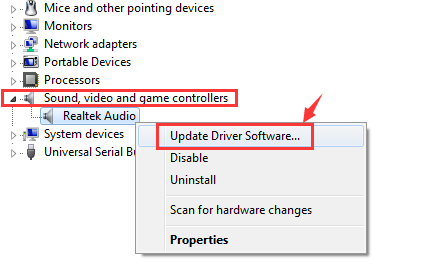 2) Затем нажмите, чтобы расширить категорию Звуковые, видео и игровые контроллеры. Щелкните правой кнопкой мыши на драйвере аудиоустройства и выберите Обновление программного обеспечения драйвера ….