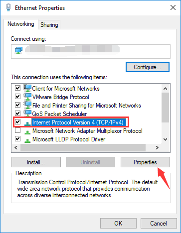 - Выберите предмет Интернет-протокол версии 4 (TCP / IPv4), а затем нажмите на свойства.