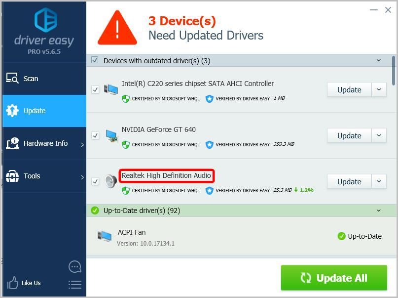 Загрузите драйвер Easy FREE, чтобы обновить драйвер Realtek HD Audio. Это исправит, что Realtek HD Audio Manager не открывается.