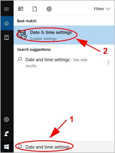 - Тип Настройки даты и времени в поле поиска на рабочем столе и нажмите Дата настройки времени.