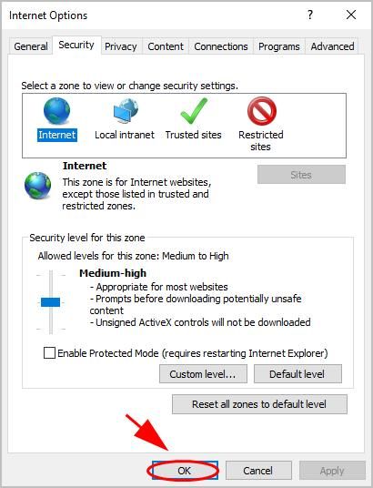 - Нажмите на Безопасность вкладку, затем снимите флажок рядом с Включить защищенный режим, и нажмите Хорошо.