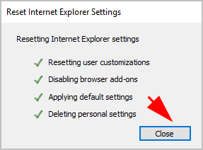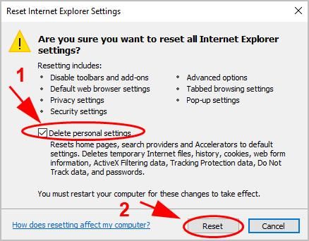 - Затем установите флажок рядом с Удалить личные настройки, и нажмите Сброс еще раз для подтверждения.