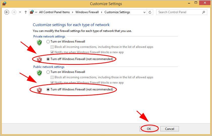 - Выбрать Отключить брандмауэр Windows (не рекомендуется) под Настройки сети домена, Настройки частной сети, а также Настройки общедоступной сети.