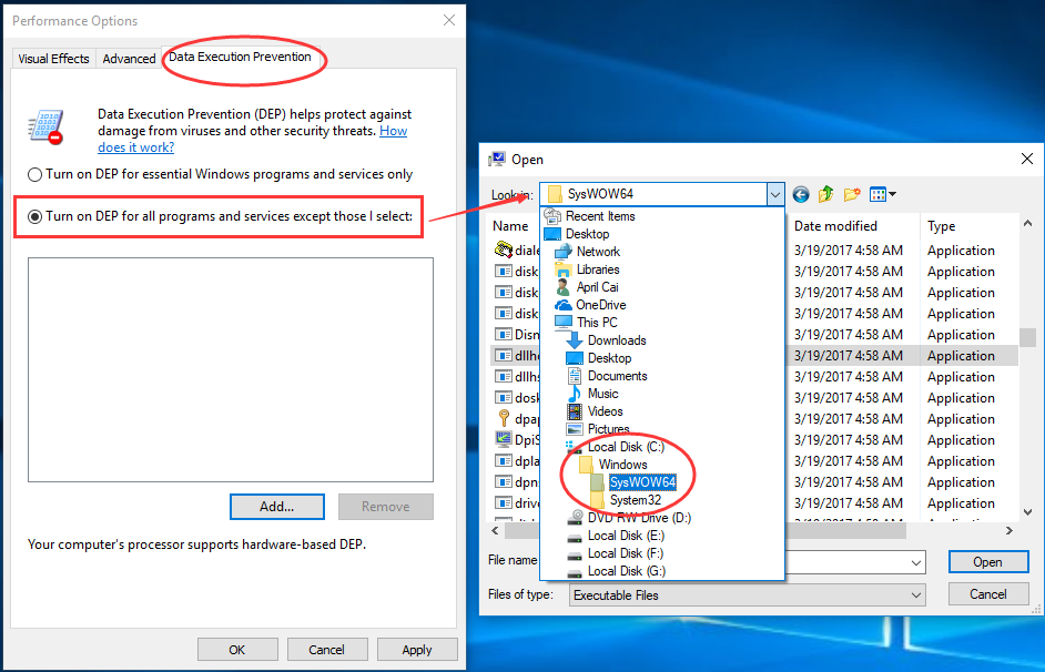 5) Отметьте Включите DEP для всех программ и служб, кроме тех, которые я выбрал: под Предотвращение выполнения данных панель. Тогда голова к C: \ Windows \ SysWOW64 или System32(база на вашей системе).