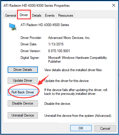 4) Выберите для просмотра на Водитель панель. Затем нажмите Откат драйвера.