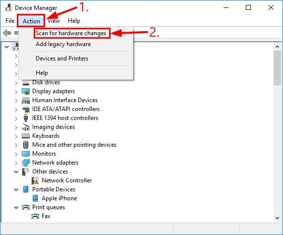 - Нажмите действие > Сканирование на предмет изменений оборудования.