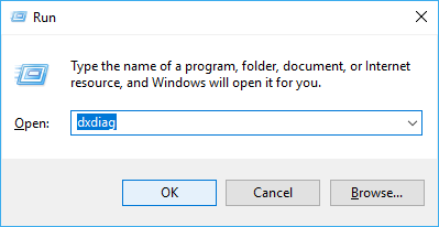 - На клавиатуре нажмите ключ с логотипом Windows а также р одновременно открыть диалоговое окно «Выполнить». Тип DXDIAG и нажмите Войти. Нажмите да если вас попросят разрешения.