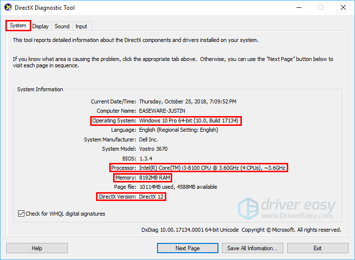 - Под система вкладку, вы можете проверить информацию о операционная система, процессор, объем памяти, а также Версия DirectX на вашем компьютере.