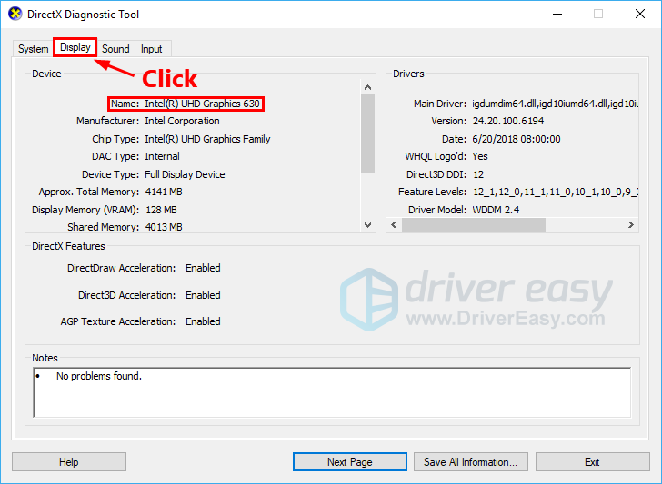 - Нажмите на дисплей вкладка для просмотра информации о вашей видеокарте.