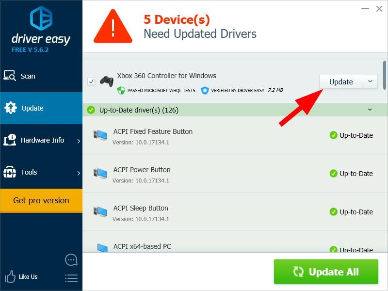 3) Нажмите на Обновить Нажмите кнопку рядом с Xbox 360 Controller для Windows, чтобы загрузить последнюю версию и правильный драйвер для него, затем вы можете установить драйвер вручную. Вы также можете нажать Обновить все кнопка в правом нижнем углу, чтобы автоматически обновить все устаревшие или отсутствующие драйверы на вашем компьютере (это требует Pro версия — вам будет предложено обновить, когда вы нажмете Обновить все).