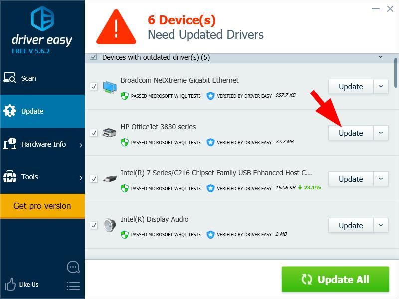 3) Нажмите на Обновить Нажмите кнопку рядом с HP OfficeJet 3830 series, чтобы загрузить последнюю версию и правильный драйвер для него. Вы также можете нажать Обновить все кнопка в правом нижнем углу, чтобы автоматически обновить все устаревшие или отсутствующие драйверы на вашем компьютере (это требует Pro версия — вам будет предложено обновить, когда вы нажмете Обновить все).