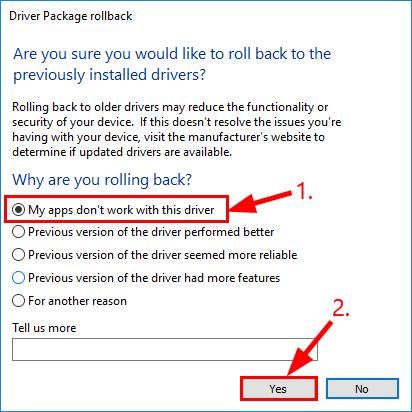 - Выбрать первый вариант отката драйвера и нажмите да.