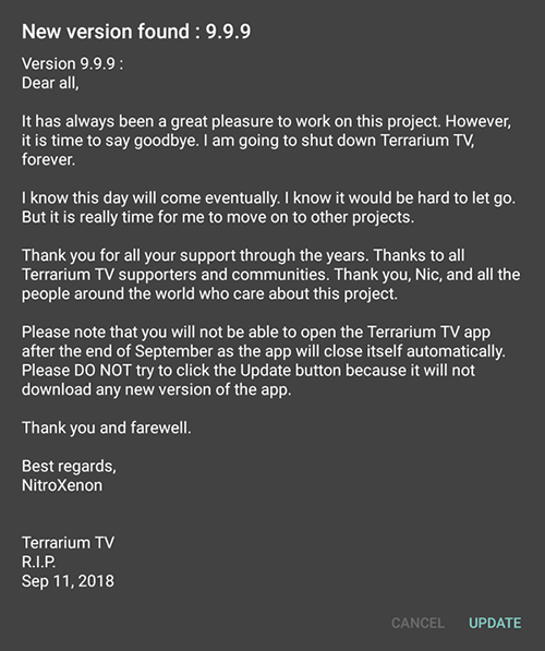 У Terrarium всегда была непростая связь, и в сентябре 2018 года он вышел из строя на несколько дней после того, как его остановил разработчик продукта, NitroXenon, с официальным заявлением разработчика, подробно описывающим его планы закрыть проект навсегда. NitroXenon также сообщил TorrentFreak, что, если того требует закон, он передаст информацию о пользователях, включая IP-адреса, людям, которые использовали Terrarium TV. Он зашел так далеко, что предупредил пользователей об удалении приложения со своих устройств, и 16 сентября разослал пользователям по каналу уведомлений на платформах, таких как Android, запрос на немедленное удаление приложения.