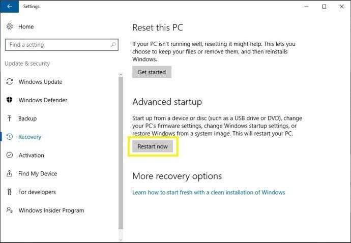 Кнопка Пуск> Настройки> Обновить Восстановление> Расширенный запуск