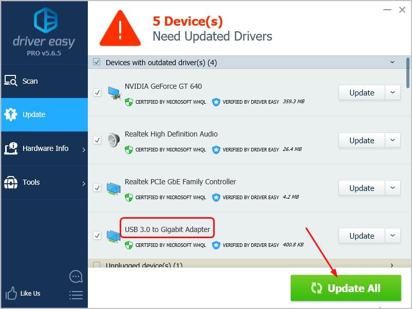 Нажмите Обновить все для автоматической загрузки и установки правильной версии всех драйверов, которые отсутствуют или устарели в вашей системе (для этого требуется Pro версия — вам будет предложено обновить, когда вы нажмете Обновить все).