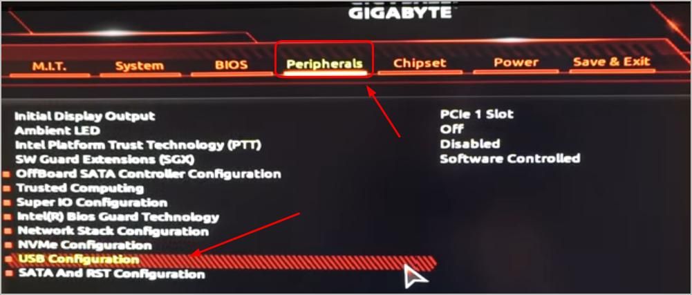 Обычно для входа в BIOS используется специальная клавиша F1, F2, Esc, F10 и т. Д. Вы можете увидеть сообщение, например нажмите F2 для STEUP, сообщающее правильный ключ при перезагрузке системы. - Как только ваша система загрузится в BIOS, нажмите стрелка вправо на клавиатуре, чтобы выбрать Периферийные устройства. Нажмите кнопку клавиша со стрелкой вниз выбирать Конфигурация USB, затем нажмите Ввод.